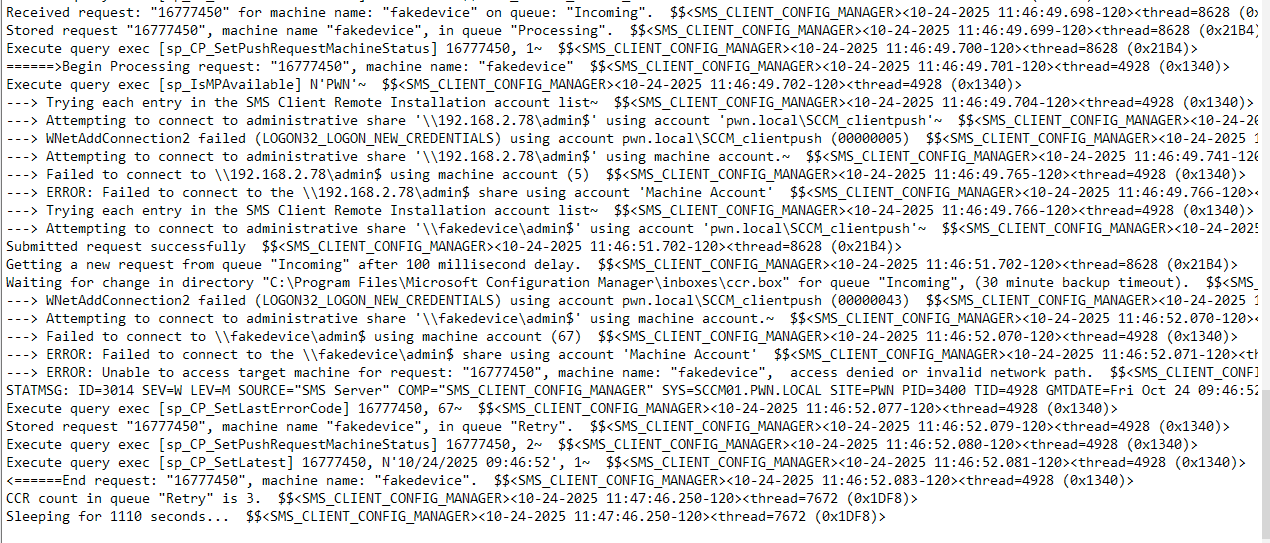 After the device is registered, a Data Discovery Record (DDR) message is sent to indicate that the client is not yet installed on the system. The DDR is essentially a message that allows the management point to maintain an up-to-date view of machines, including their hardware, operating system information, and client installation status. By sending a DDR that indicates that the client is not yet installed, we can signal to the site server that this is a new device, and is a candidate for Client Push installation. To process these requests, SCCM uses queues. By sending a valid DDR request, the device will be placed in the "incoming" queue, meaning the installation will be performed almost instantly.